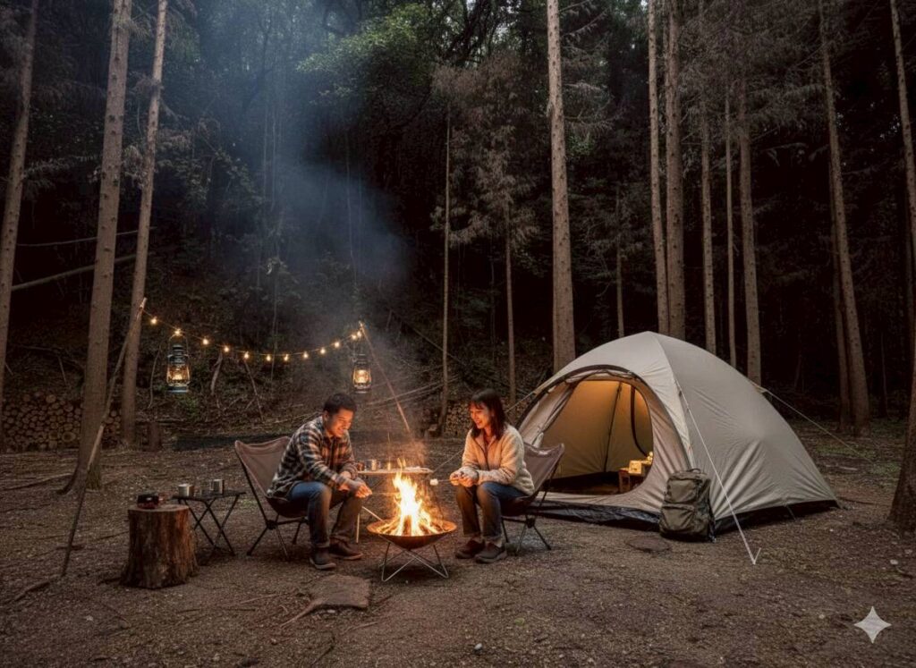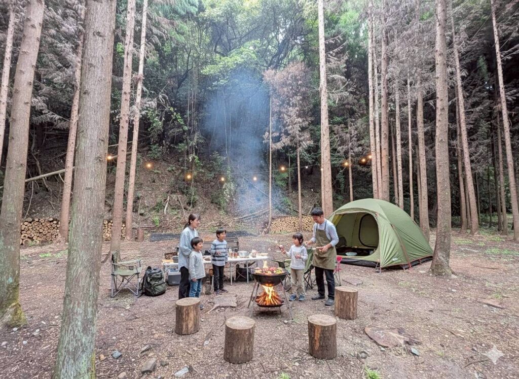 林の手入れの間伐と共に作られた<林間サイト>は一日一組限定。