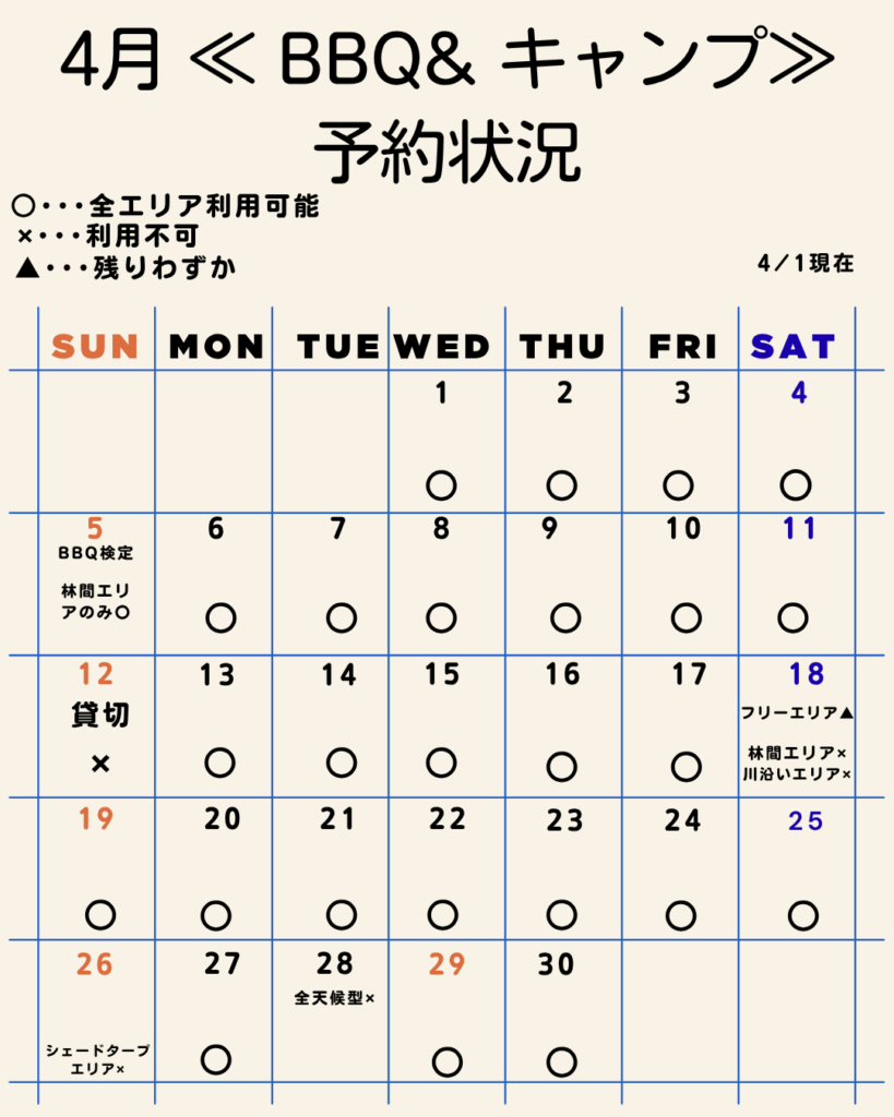 4月≪BBQ&キャンプ予約状況≫ 2026 4/02 お知らせ お知らせ MIYAKODABBQFIELD キャンプ バーベキュー 屋根下 屋根付き 浜松市 都田バーベキューフィールド 都田川 よかったらシェアしてね! URLをコピーしました! URLをコピーしました!