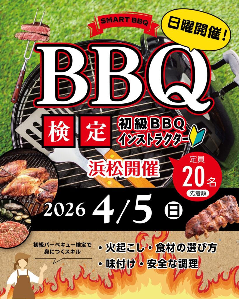 静岡県浜松市で開催される、初級BBQ検定のご案内! 【初級バーベキューインストラクター検定|日本BBQ協会公認】2026年4月5日(日)静岡県浜松市にあるMIYAKODA.BBQ.FIELDで開催されます。夏本番を迎える前にバーベキュースキルを身に着けて、バーベキ...未分類 -