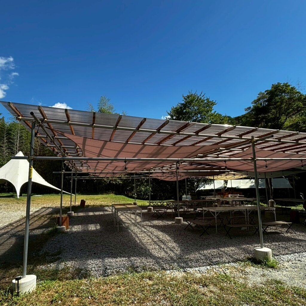 屋根場完備(A:大型全天候エリア B:スターテントエリア C:川沿いシェードタープエリア)